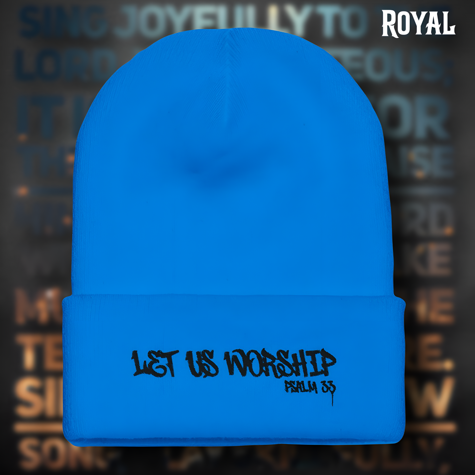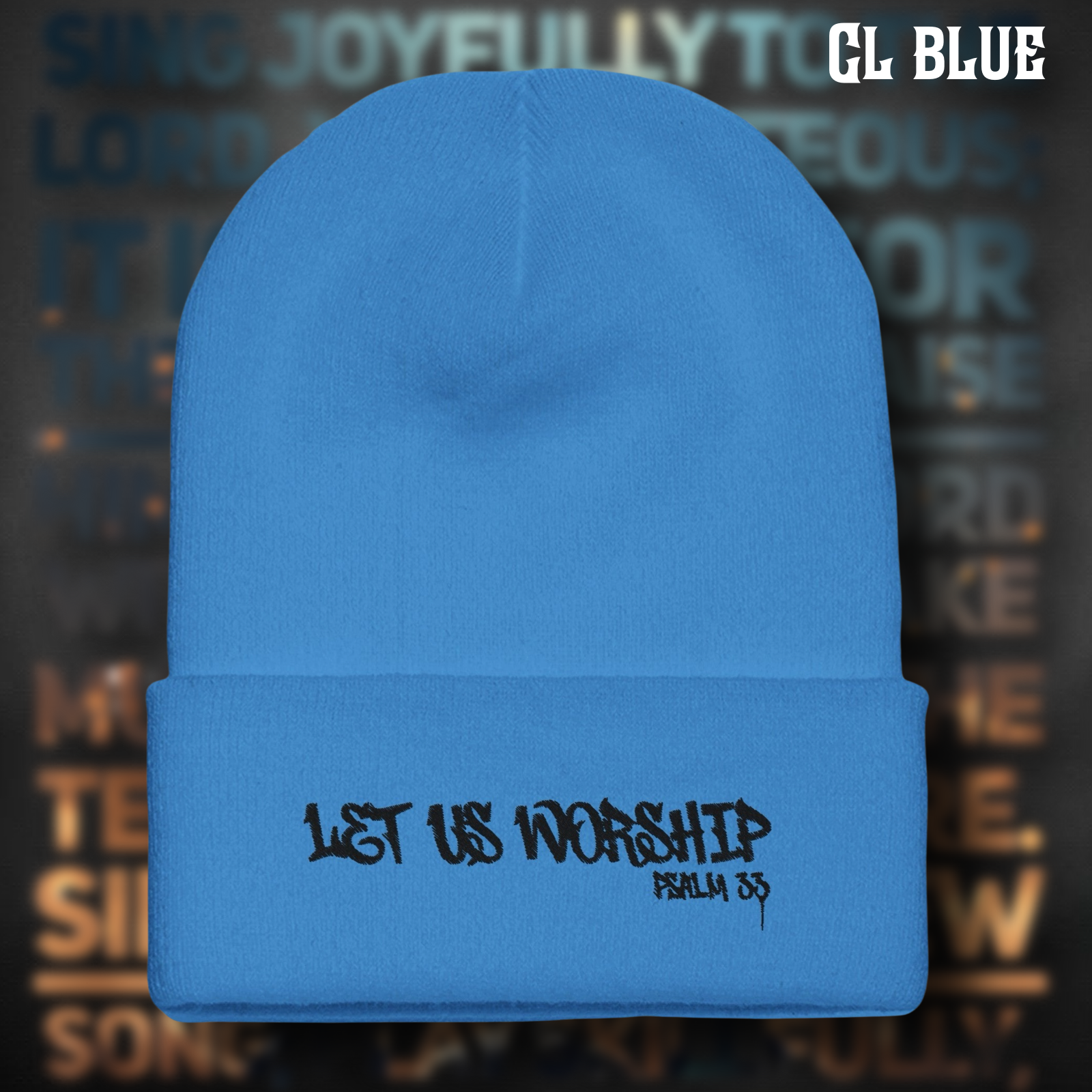 Step into warmth and stylish expression with the Flexfit Classic Cuffed Beanie, featuring the inspiring phrase 'Let Us Worship' prominently displayed.