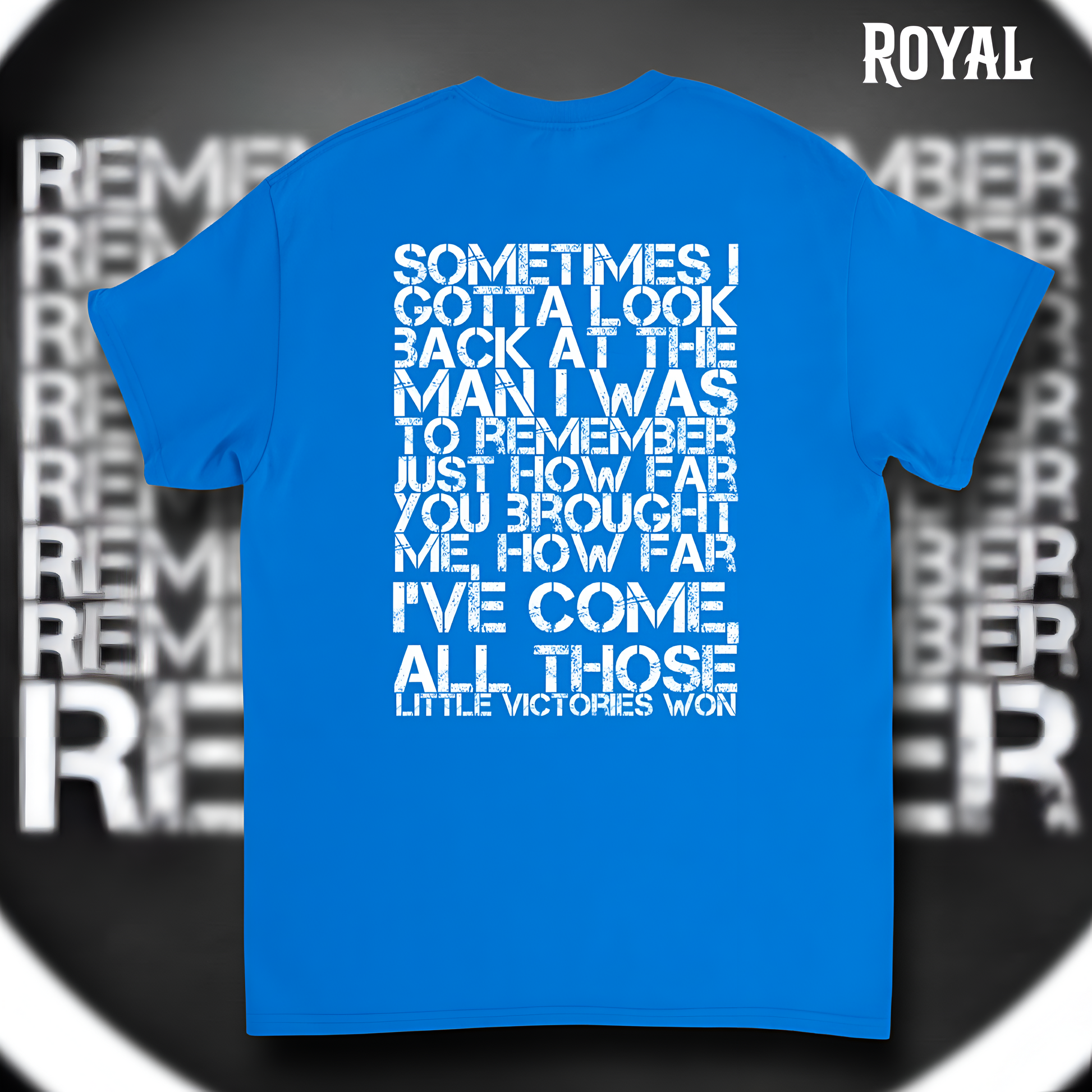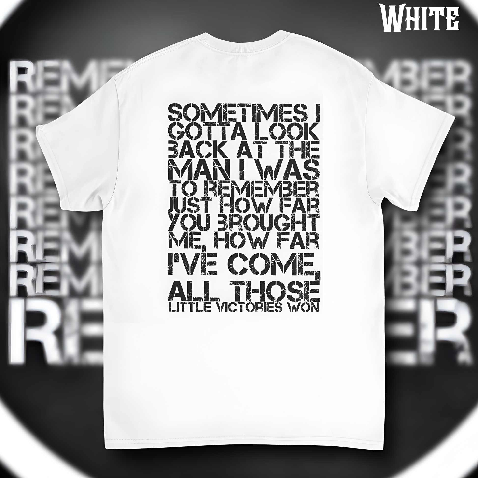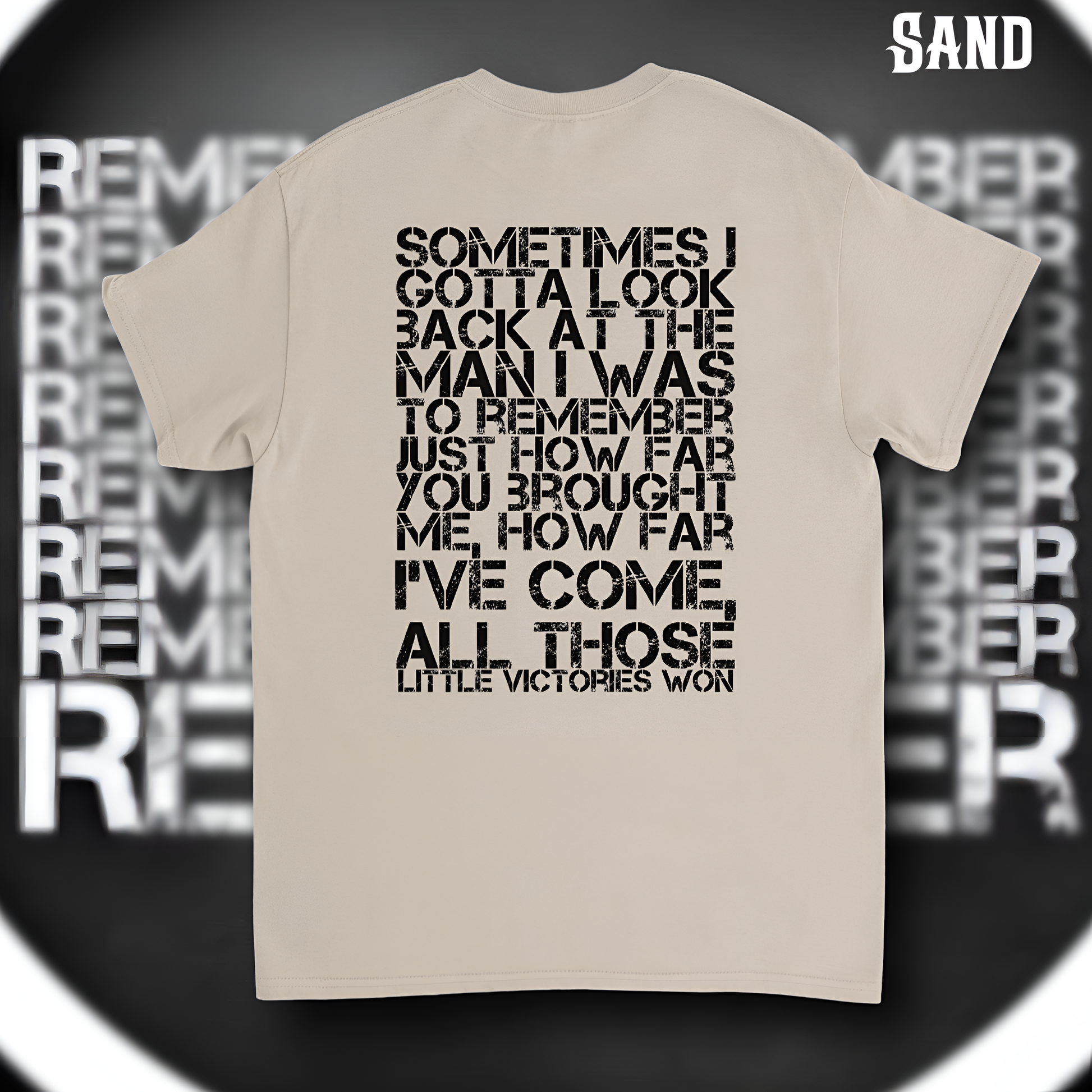 The front logo of this tee has the word "Remember" 15 times in it. The Book of Deuteronomy says "remember" 15 times and is known as the book of remembrance. It's such a vital thing to look back and remember what God brought us out of. If we don't take the time to remember, our gratitude can become diluted.