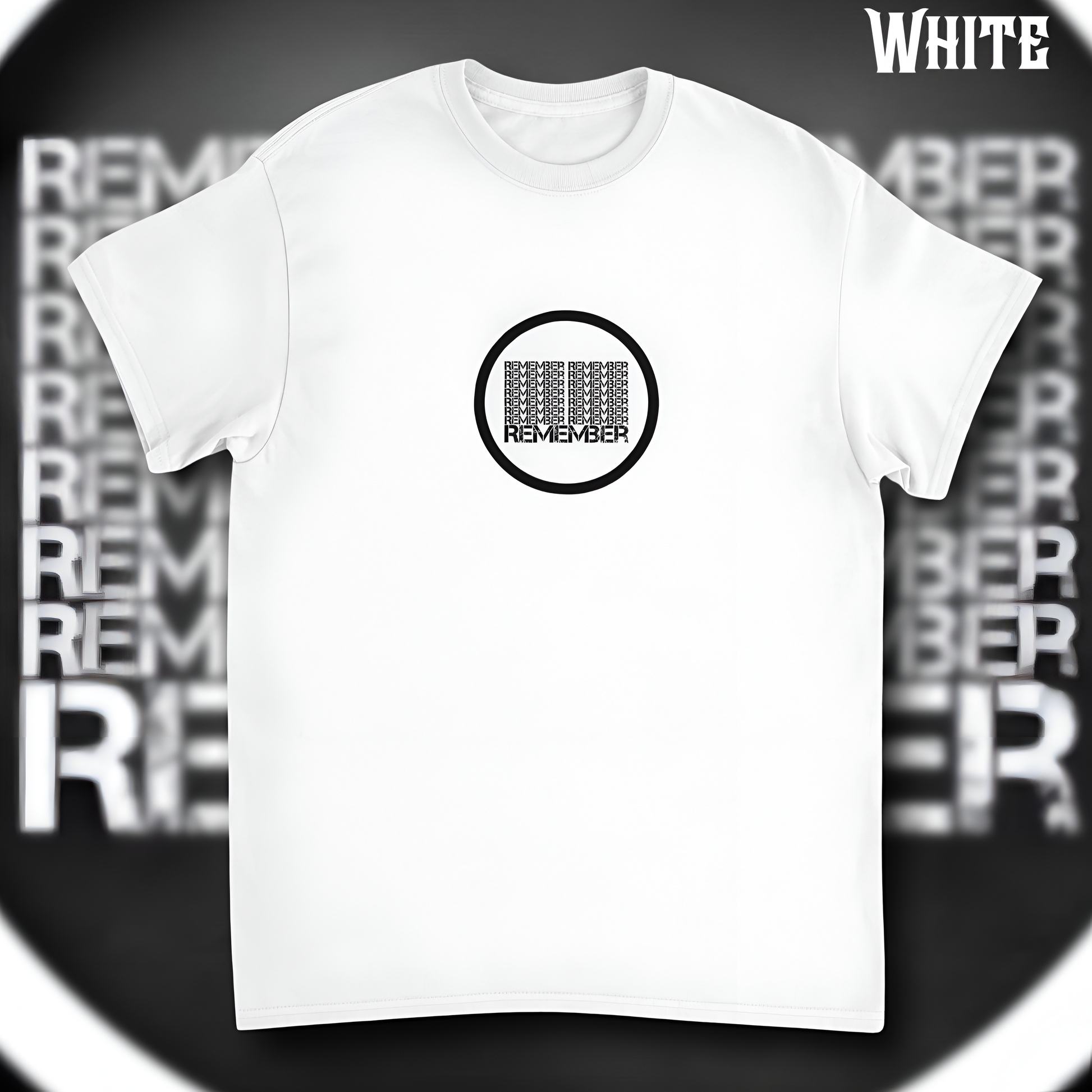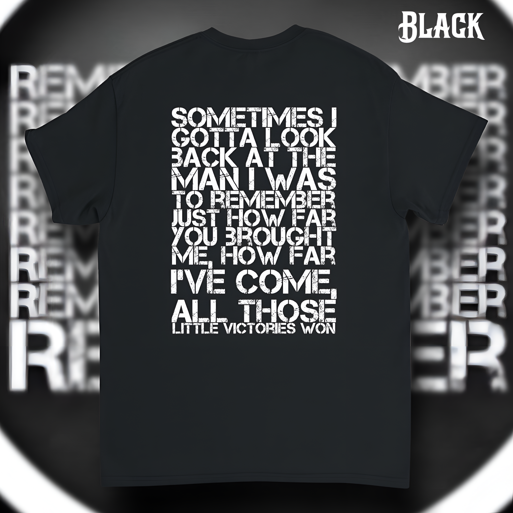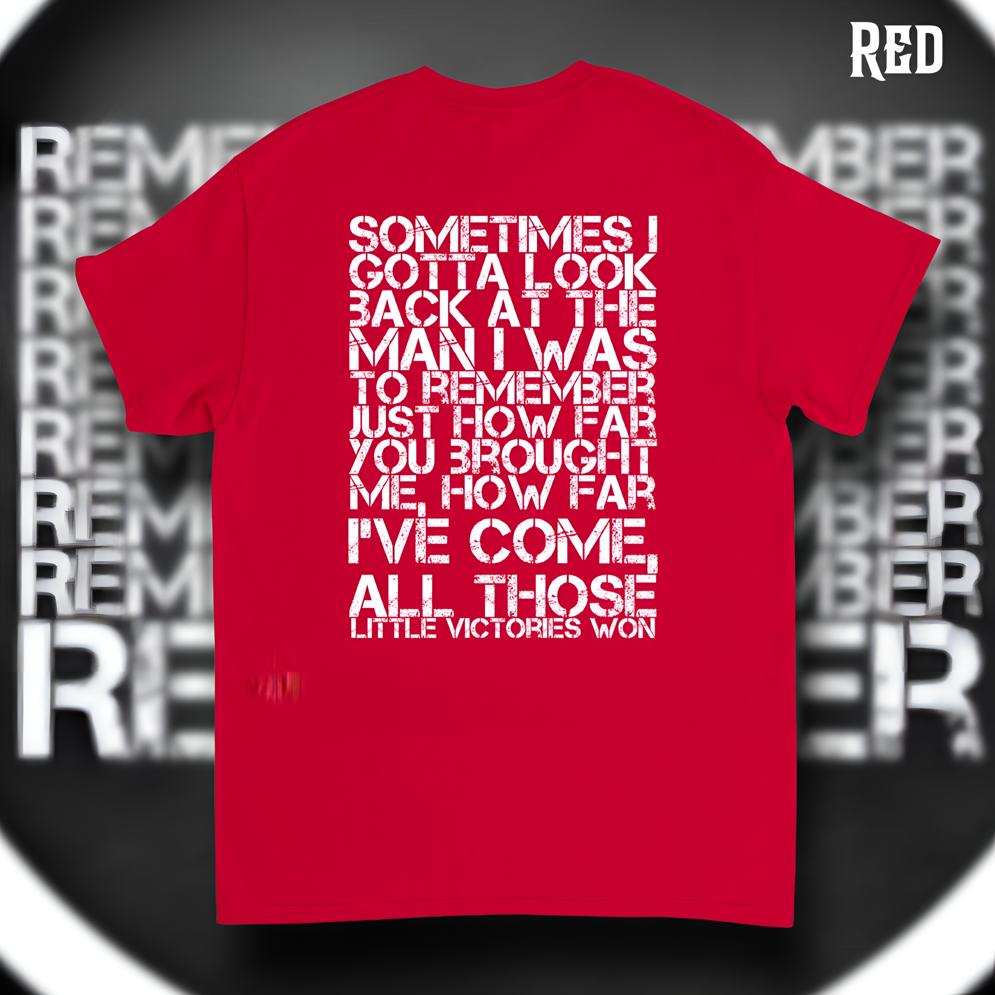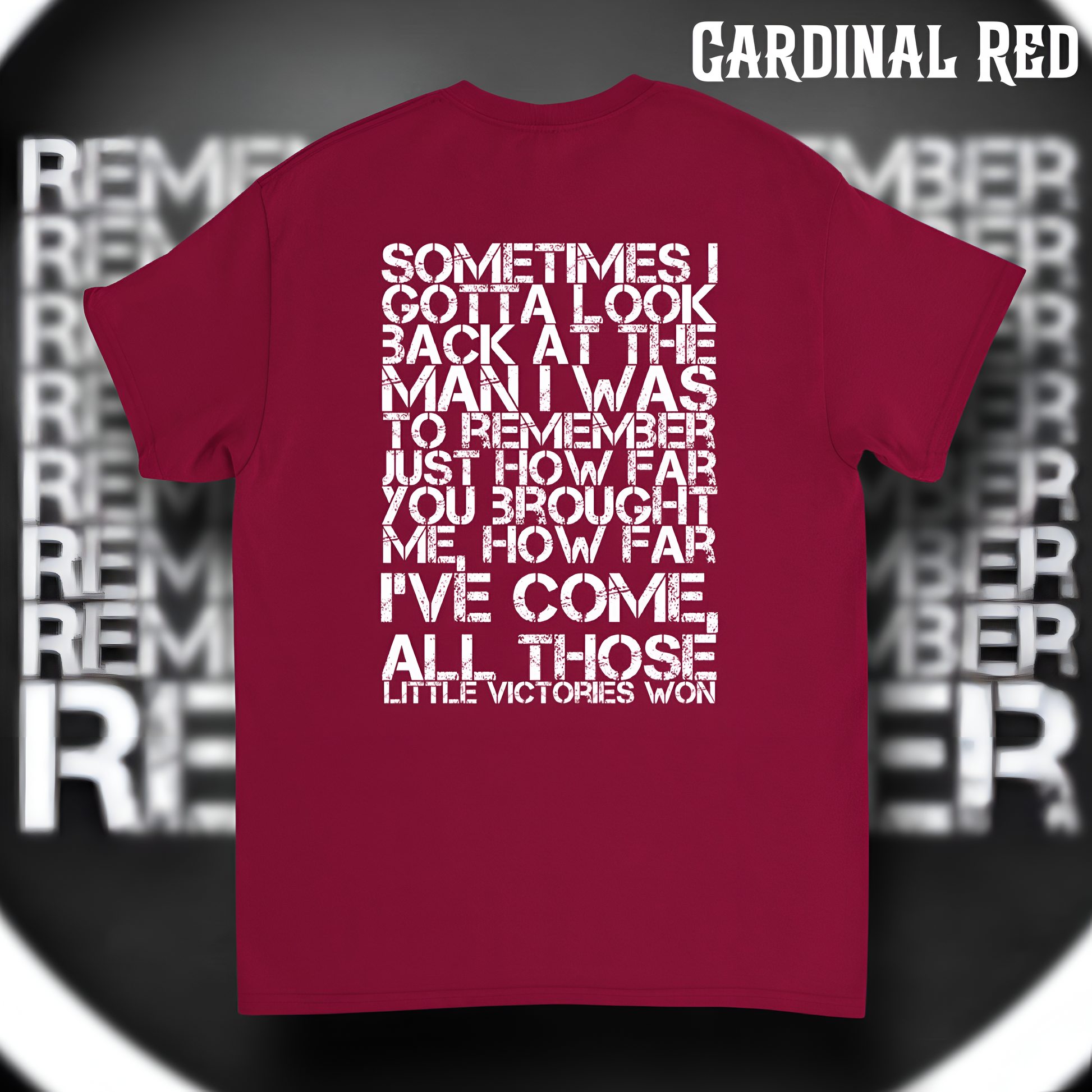 The front logo of this tee has the word "Remember" 15 times in it. The Book of Deuteronomy says "remember" 15 times and is known as the book of remembrance. It's such a vital thing to look back and remember what God brought us out of. If we don't take the time to remember, our gratitude can become diluted.